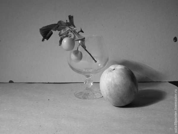 Стоило исчезнуть ярким цветам и… мы видим, что все наши предметы одинаковые. Все серое, причем, одинаково серое 🙂 Но наш натюрморт не стал плоским. Мы по-прежнему видим игру света и объем ягод и яблока. Теперь присмотримся внимательно. Стекло понятно, оно прозрачное. Листики у алычи тоже явно темные. А вот алыча и яблоко, как оказалось, одинакового цвета (именно цвета, а не тона) с фоном! Но, если присмотреться — ягодка слева светлее фона, а справа темнее фона. И яблоко тоже сверху и слева оно явно светлее, а справа оно темнее фона. Там еще есть тень! Но и там яблоко не сливается. Такое наблюдение очень полезно для создания объема. Очень полезно в процессе работы смотреть на черно-белое фото нашей натуры и свой натюрморт будет не лишним сфотографировать и посмотреть, где нам нужно высветлить или прибавить теней.