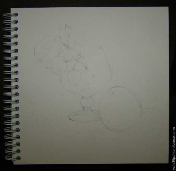Теперь наш бокал обрел форму. Лишние места, которые мы с вами «додумывали» можно немного стереть. Наметим веточку и ягоды. Ягоды имеют овальную форму. Обязательно смотрим на пропорции и на место, где находятся наши ягоды. Какой их размер относительно бокала.