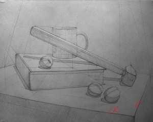 Наметили композицию на вашем листе? Тогда, можем создавать пространство для вашего натюрморта. Собственно говоря, мы уже его создали, осталось только усовершенствовать его с помощью игры светотени и здесь штрих нам в помощь.