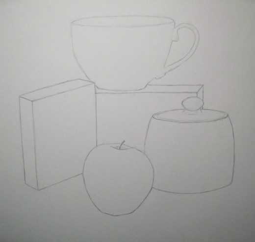 Набросок делаем легкими скользящими линиями. Чтобы не ошибиться с пропорциями предметов, мысленно представим центральную ось для каждого из них. Можно изобразить ее на листе, на котором мы рисуем натюрморт карандашом. Поэтапно зарисуем геометрическую форму, лежащую в основе каждого объекта, и из нее создадим сам объект. В основе яблока и чашки будут окружности, коробки получаются из параллелепипедов, сахарница основывается на квадрате, а ее крышка – овал.
