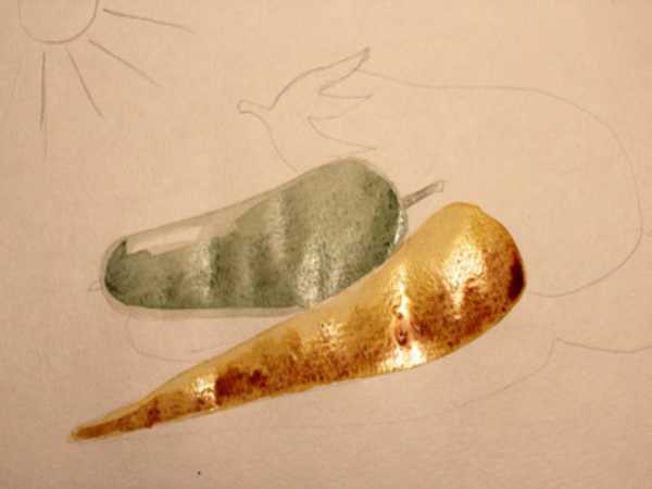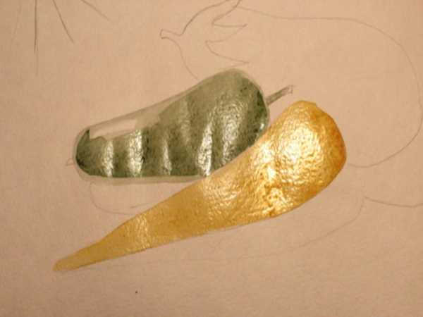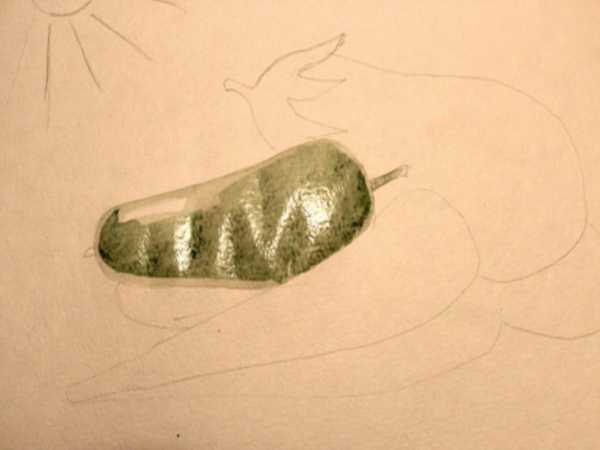 2. Приступаем к рисованию акварелью. С помощью кисточки увлажняем один из элементов натюрморта (в нашем случае, огурец). Покрываем огурец очень светлой зеленой краской.