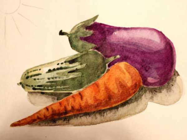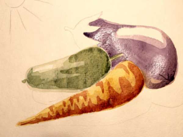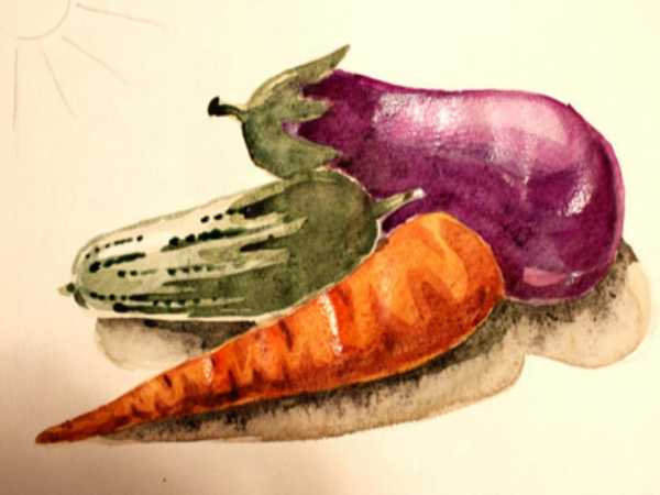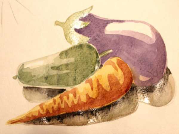 7. Баклажану и морковке добавляем более темные тона, стараясь лучше показать их форму — гладкость баклажана и все неровности моркови. Чем глубже впадина, тем темнее тон.