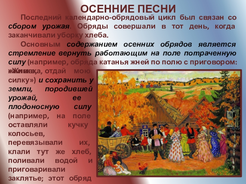 | Разучивание хороводных, подвижных игр и игр малой подвижности Познавательная минутка «Лечебные свойства рябины» Беседы о традициях русского народного праздника «Рябинник». Составление совместно с родителями альбома «Волшебная рябинка» Изготовление атрибутов для праздника. Организация русского народного праздника «Рябинник» |