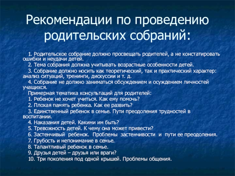 «Душевный разговор». Собрание рассчитано не на всех родителей, а лишь на тех, чьи дети имеют общие проблемы (в общении со сверстниками, агрессивность и др.