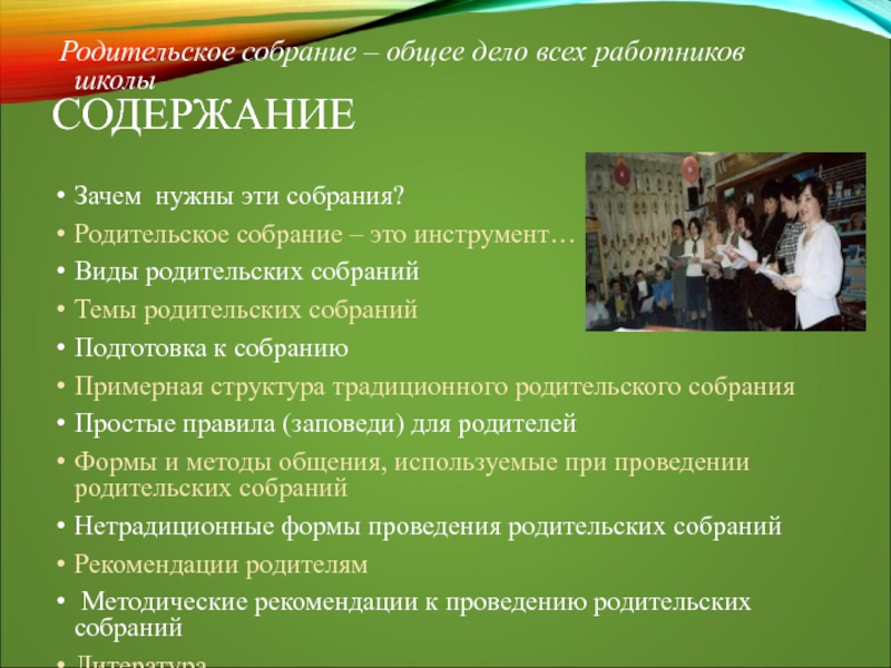«Мастер – класс». Собрание, на котором родители демонстрируют свои достижения в области воспитания детей. Собрание имеет подготовительный этап: педагог предлагает нескольким родителям провести маленький урок – поделиться опытом по развитию у детей, например, связной речи. Родители дают практические советы, показывают ролевую сценку или игру, например, составление загадок «Узнай по описанию». В конце собрания подводится итог, и родители предлагают выбрать наиболее ценные советы, которые размещаются на стенде « Копилка родительского опыта».