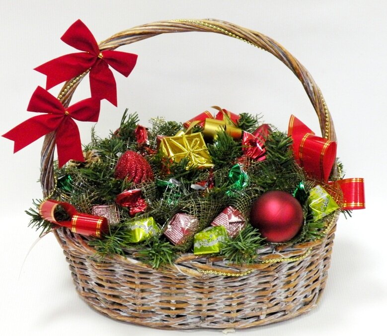 Ими можно повязать ручку корзины либо украсить фронтальную сторону. Также к ручке корзины можно приклеить или привязать небольшую открытку с пожеланиями к Новому году.