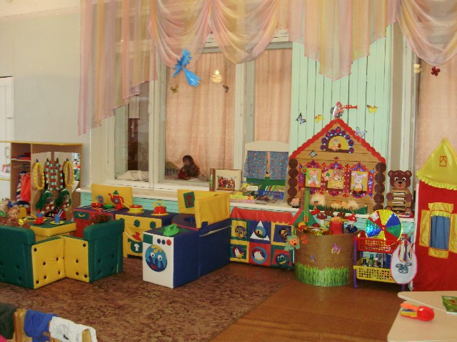 Игровую зону надо оформлять ярко – в синих, желтых, оранжевых и зеленых тонах, это увеличит игровую активность. В младших группах интерьер должен напоминать сказку, это создаст у детей радостное настроение и поможет развиться их воображению.
