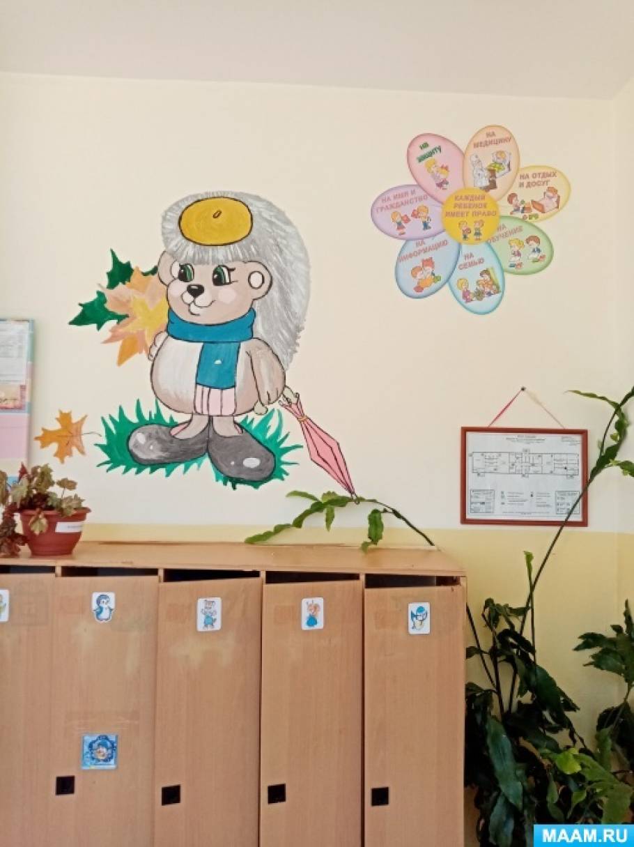 В этом оформлении разворачивается целая осенняя история – яркая, красочная, с лесными жителями. Оформите так любой уголок в группе: игровой, рабочий или во входной группе.