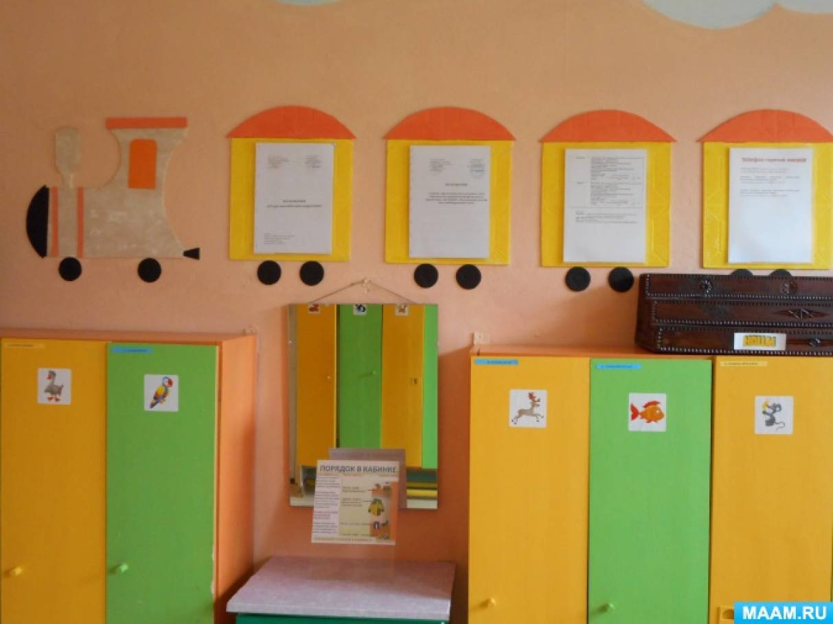 Иногда для экономии места в групповой комнате письменный стол и стул воспитателя размещают в приемной, которая одновременно является . Это тоже весьма удобно, потому что воспитатель имеет возможность отмечать прием детей в табеле посещаемости, и одновременно беседовать с родителями по многим организационным вопросам.