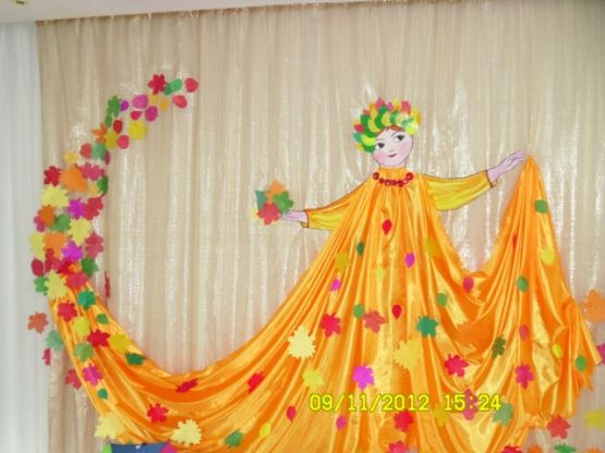 Общего много: приколотые к занавесям листочки, портрет «королевы осени» (нарисованное лицо дамы в платье из драпированной ткани), сухие ветки, к которым плилеплены скотчем осенние листья, грибочки, улетающие на юг птицы в правом верхнем углу. В некоторых случаях все это выглядит очень даже красиво.