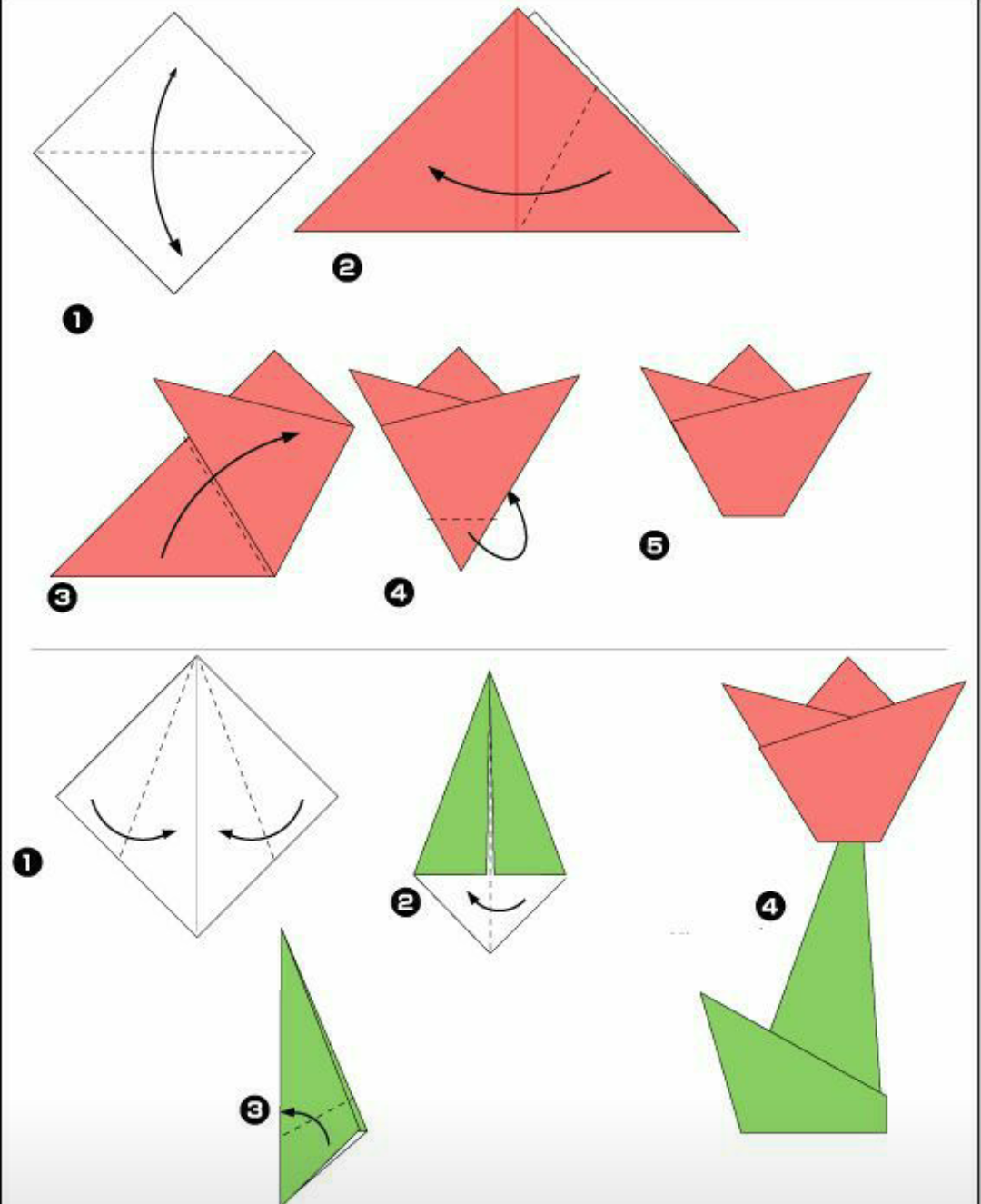 Разверни второй слой маленького ромба и сделай все то же самое, а потом – надуй бутон и отверни в стороны лепестки. Для стебля тюльпана с листком зеленый ромб загни боками к центру сначала сверху, а потом снизу. Подверни верхние бока еще раз и согни деталь пополам: тонкая часть – это стебель, а более толстую – разверни в листочек.