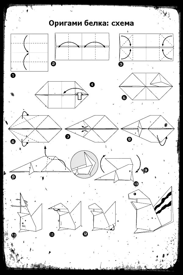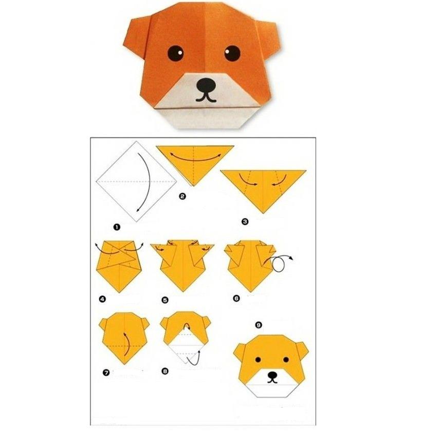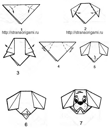 Если вы еще не очень хорошо владеете данным искусством, то предлагаем для начала сложить мордочку щенка. Схема этой поделки очень простая и сложить такую поделку сможет каждый, даже ребенок. В дальнейшем эта мордочка может послужить ему закладкой в книжку или, приклеив на другой лист бумаги и дорисовав туловище, мы получим открытку, которую можно кому-то подарить. Переходим к складыванию фигурки.