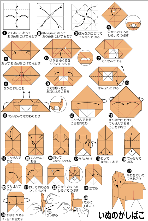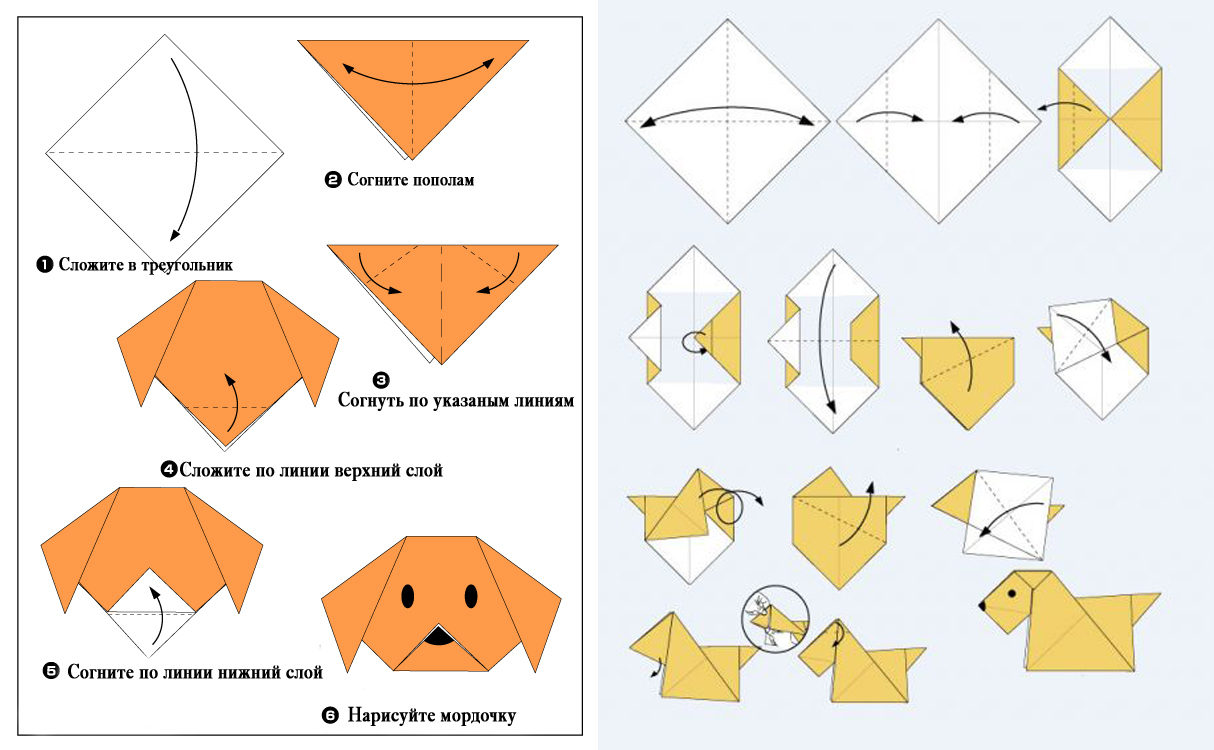 Оригами состоит в складывании из бумаги различных фигурок. Существует множество способов, которые позволяют сложить из бумаги как собак различных пород, так и их отдельные части тела (например, голову). Оригами заниматься весело и просто – достаточно иметь лист бумаги и жесткую поверхность, чтобы сложить его. Собаку средней сложности можно сделать из бумаги за 5-12 минут, в зависимости от вашего опыта.