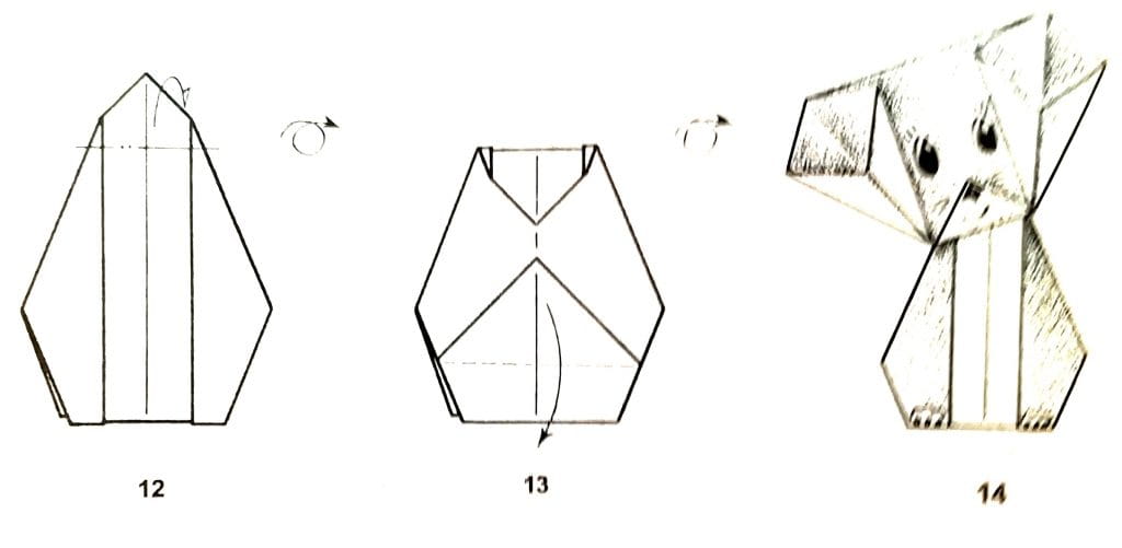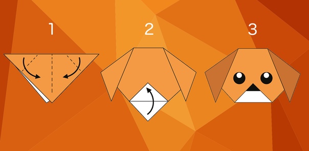 Например, можно согнуть нижний край треугольника, чтобы получилась собачка с открытой пастью. Смотрите схему оригами на картинке ниже.