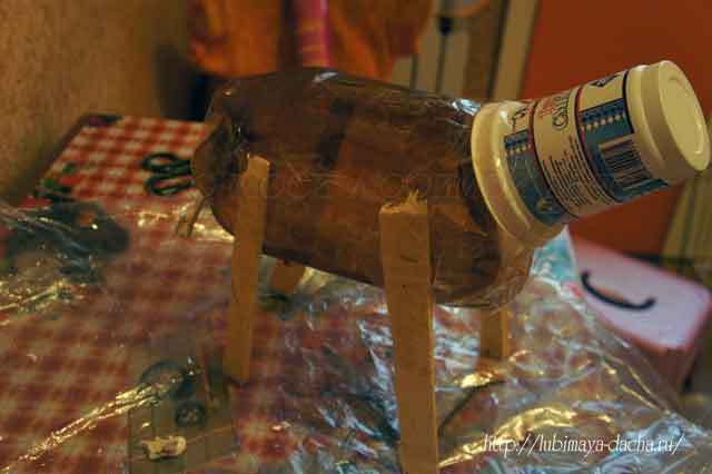 Можно прикрепить ножки ослика к туловищу без дощечек и саморезов: в пятилитровой ёмкости делают отверстия и вставляют в них бутылки с песком, скрепив конструкцию при помощи клея