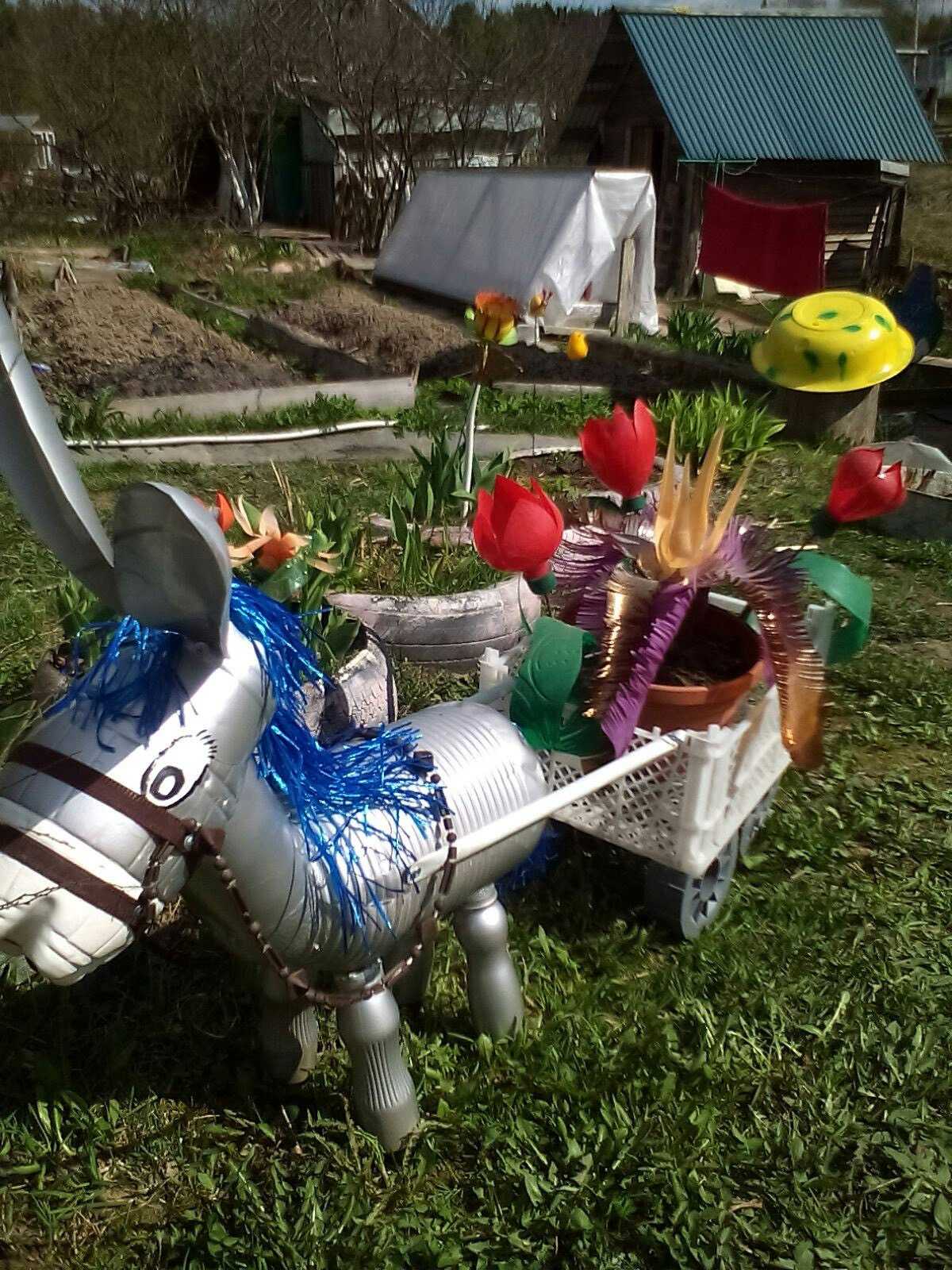 Такая модель ослика из пластиковых бутылок своими руками куда сложнее в исполнении, но она станет прекрасным украшением ландшафта. Для работы вам потребуются: