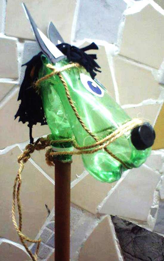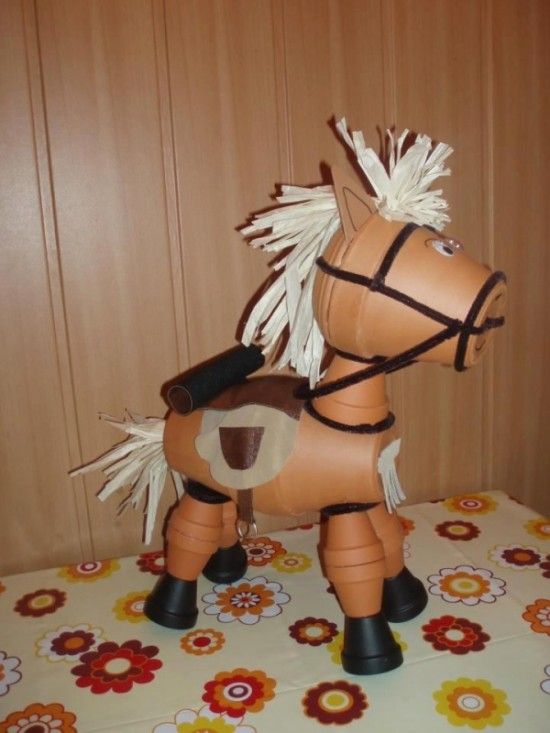 Финальный штрих – украшение фигуры. Ее следует окрасить акриловой краской, которая предназначена для наружных работ. Хвост и гриву делаем из толстой пряжи, но лучше использовать тонко нарезанные полоски из пластиковой бутылки. Отлично справится с этой задачей самодельный бутылкорез. Все элементы декора фиксируем на шее и ножке животного.