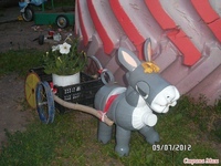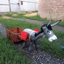 Для того чтобы изделие более органично смотрелось в интерьере сада, при помощи сбруи и оглобель можно запрячь ослика в тележку. Миниатюрной повозкой может служить обычный пластиковый или деревянный ящик, любая обрезанная пластиковая ёмкость с колёсами от старой детской машинки, которые можно закрепить на оси из электродов для сварки.