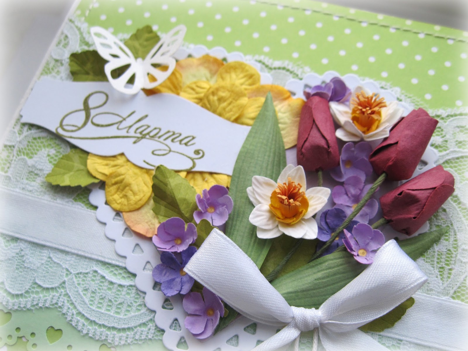 Они не должны перекрывать друг друга. Когда все четыре части приклеены, края лепестков немного загибаются вверх, так, чтобы он был объемным. В тех местах, где будут листочки из атласной ленты, согнутой пополам, сначала прикрепляется лист, а поверх него приклеивается сам цветок. Объемная открытка с цветами своими руками завершена. Остается подписать пожелания.