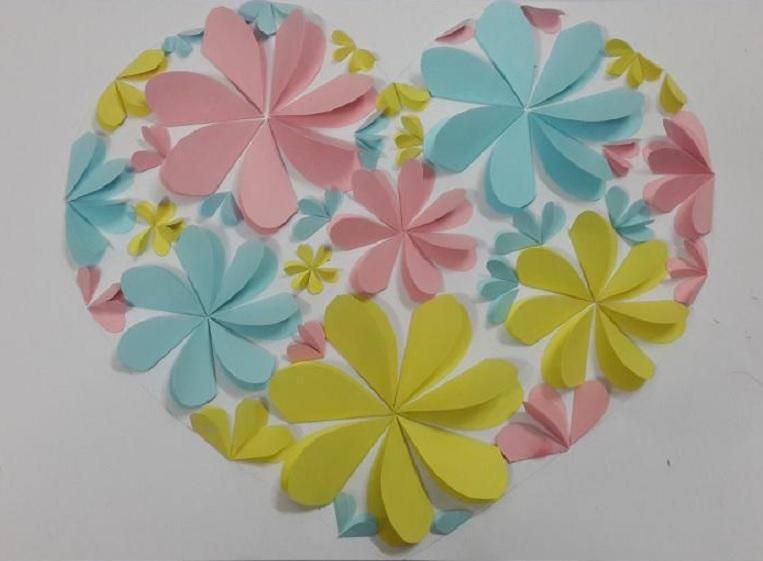 Эту очень красивую поделку легко выполнить из плотной цветной бумаги: по силам она будет не только взрослым, но и детям. Открытка с сердцем и бутонами прекрасно подходит для поздравления с днем рождения и любым другим праздником!