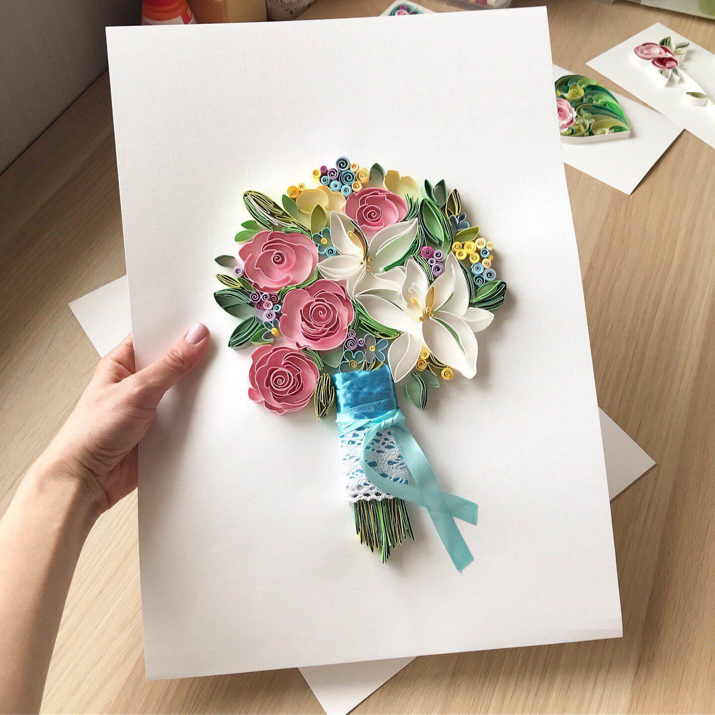 5. Сформируйте из бумажных заготовок объемные цветы, добавьте в их серединку полубусинку или стразу.