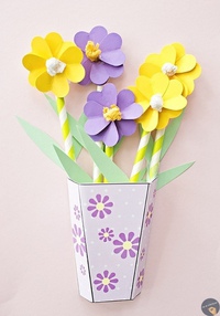 7. Вставьте прямоугольник с цветами за бумажный горшок так, чтобы нижние лепестки и листья цветов оказались на горшочке сверху. Приклеивать прямоугольник с цветами к передней части открытки не стоит, на нем можно будет написать поздравление, а затем вынимать из горшка и вставлять обратно.