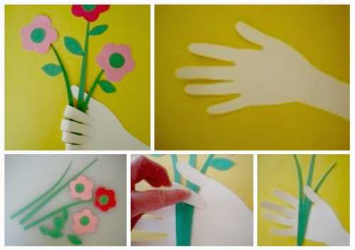 Теперь собираем все воедино. На картонную основу открытки крепим ладошку, оставляя свободными пальчики. Далее клеем букет, как-бы вкладывая его в руку. Смотрите фото с инструктажем снизу. Когда букет проклеен, можно загибать пальчики и склеивать. Все, ваша поделка готова. Глядя на нее, создается впечатление, что рука несет букет маме.