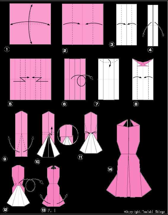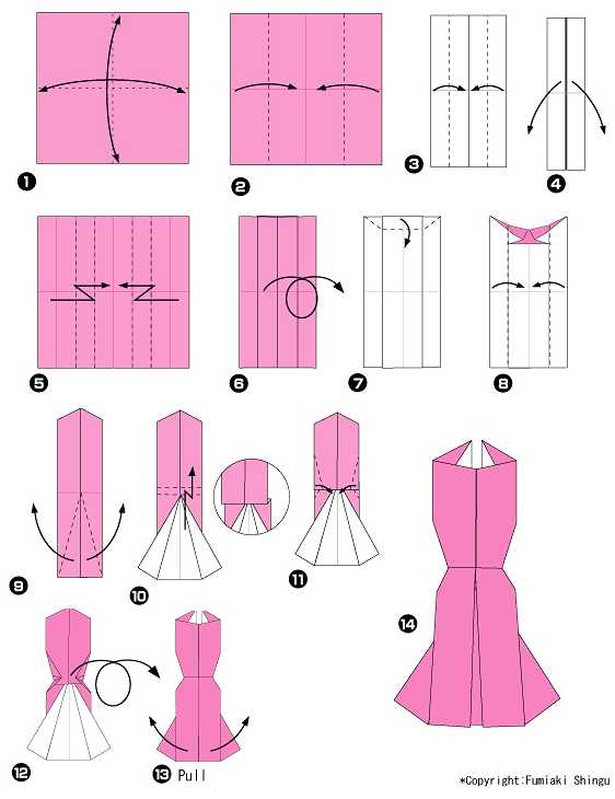 Ещё один вариант открытки маме на день рождения своими руками от дочки в технике оригами, немного посложнее бумажного цветка. Эта схема «Платье» придумана талантливым мастером Фумиаки Шингу.