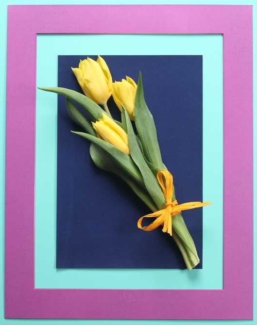 Цветы лучше выбирать не высокие и не крупные, чтобы они не перебивали всю открытку, а смотрелись гармонично. Например, подойдет один тюльпан, чайная роза, ветка сирени, гиацинт и другие.