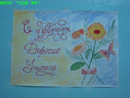 Стенгазета со стихами и цветами на День УчителяА эта стенгазета идет в ногу со временем и отображает напечатанное поздравление на компьютере.