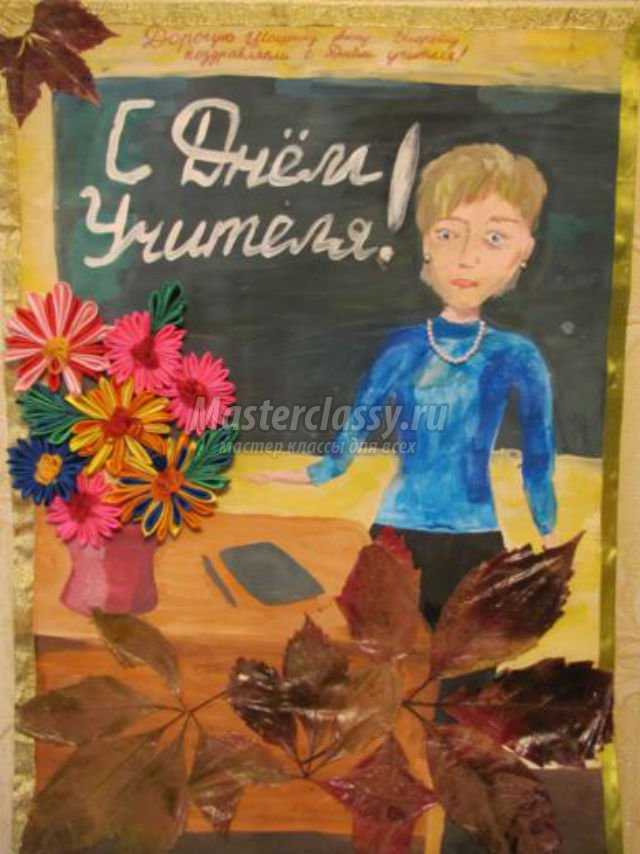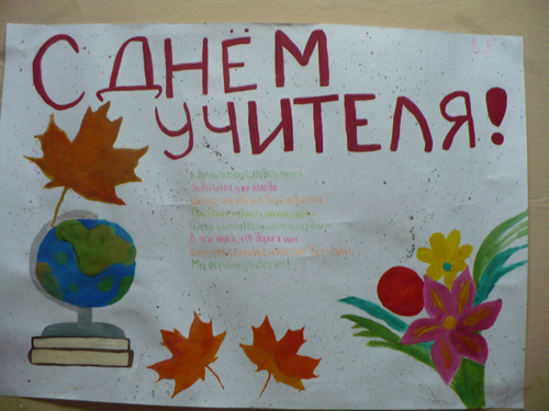 Школьники постарше иногда придумывают и создают всем классом не просто рисунки, а целые плакаты на День учителя, куда можно вклеивать фотографии, делать аппликации, и, конечно же, рисовать.