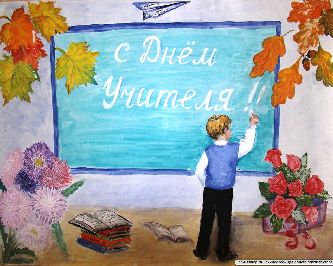 Как правило, характерной деталью каждой картинки ко Дню учителя становится школьная доска. Она делает образ учителя узнаваемым и помогает заполнить пространство рисунка.