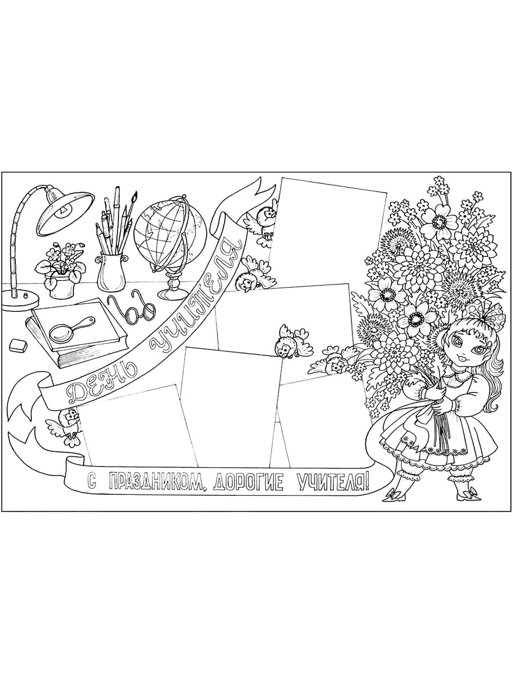 Открытка с букетомПоздравление на День УчителяНастенная газета подойдет для поздравления всего школьного коллектива, если разместить его в холле учебного заведения или учительской. Оригинальность общему коллажу придадут отдельные поздравительные тексты, которые ученики посвятят своим любимым педагогам. Но при использовании этой идеи нужно проследить, чтобы каждому из учителей были посвящены хотя бы несколько добрых слов.
