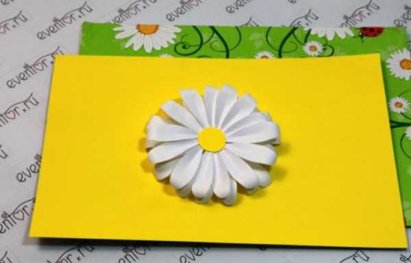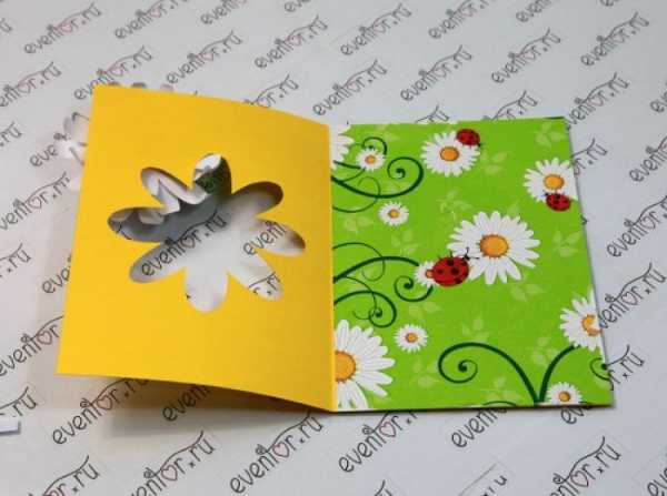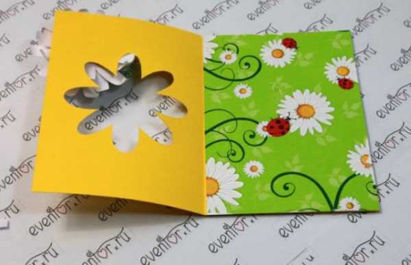 4. Возьми желтый (или какой Тебе больше нравится) картон, согни его пополам. Это заготовка для будущей открытки. На первой странице вырежи отверстие в форме ромашки.