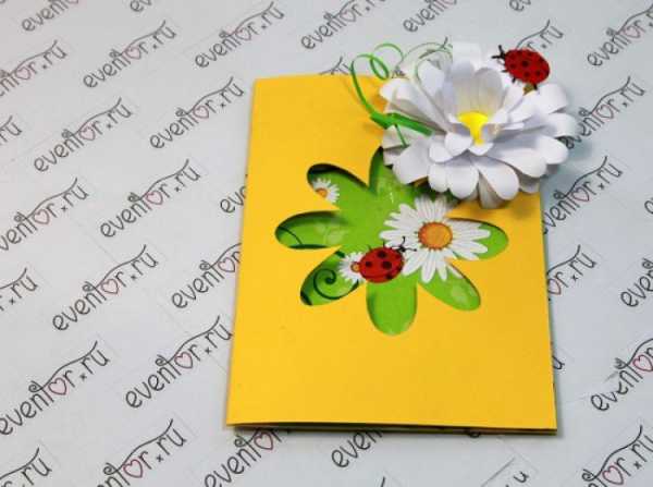 Для божьей коровки из красной бумаги вырезать овал и декорировать мелкими черными кружочками. Потом приклеить к нему головку и ножки. На первую страницу «посадить» на клей ромашку и божью коровку. Внутри на пустой однотонной странице написать красивое, доброе и трогательное поздравление.