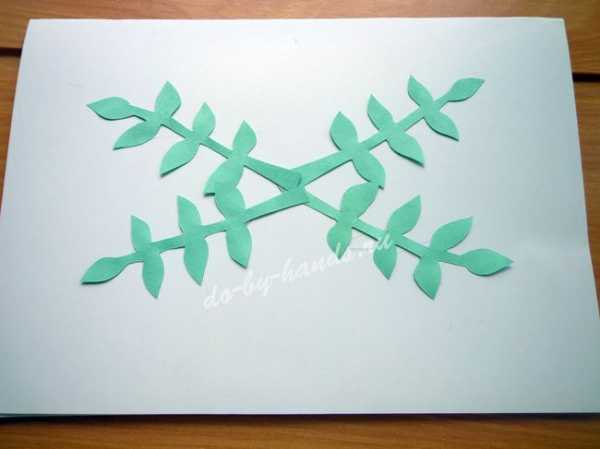 Из цветной зеленой бумаги вырезать два листика, схожих по форме с листами сирени. Каждый из них аккуратно сложить пополам и прижать линию сгиба руками. С изнаночной стороны по всей длине промазать сгиб клеем и аккуратно приклеить к фону. Когда клей прихватится, краешки листиков немного приподнять над основой.
