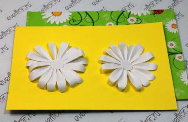 2. Приклей лепестки к середине цветка. Сделай еще одну такую же ромашку.