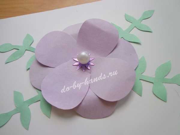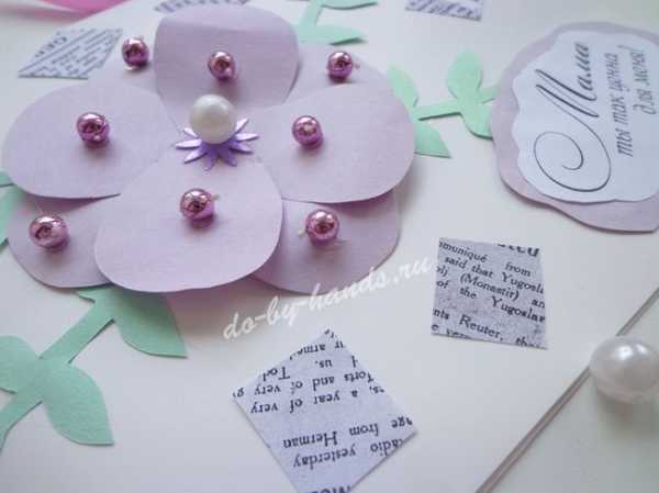 Лист белоснежного картона сложите пополам и по линии сгиба проведите ручкой ножниц для закрепления линии сгиба. Картон берите средней плотности. Распечатайте любую газетную страницу с интернета на альбомном листе и нарежьте ее на полоски, шириной около 1 см. Каждую полоску нарежьте на квадраты. Ими мы будем обклеивать по контуру открытку своими руками для мамы. Зеленый лист бумаги для записей сложите пополам и нарисуйте контур листьев для цветка. С помощью маленьких ножниц вырежьте лепестки по контуру. Таких заготовок для открытки нам понадобиться 4 штуки. Фиолетовый лист бумаги для записей сложите вчетверо и отрисуйте контур лепестков цветка для открытки. Вырежьте по контуру. Таких деталей – лепестков нам нужно будет 8 шт. Бумажные детали начинаем клеить к картонной основе открытки своими руками с помощью клея ПВА. Клеим листья. Каждый лепесток цветка слегка закруглите во внутрь с помощью ножниц и приклейте первые 4 элемента. Между первыми лепестками наклейте еще 4 лепестка. В центр уже готового сформированного цветка с помощью горячего клея прикрепите паетку. На паетку прикрепите хорошо смазанную горячим клеем крупную белую бусинку. Из фиолетового листа для записей вырежьте заготовку овальной формы, а также вырежьте надпись для открытки. Надпись по размеру должна быть на 5 мм меньше овальной фиолетовой заготовки. Приклейте в правом нижнем углу сначала фиолетовую заготовку для открытки своими руками, а на нее – надпись для мамы. По контуру открытки наклейте с помощью клея ПВА кубики из газетной заготовки. На лепестки наклейте с помощью горячего клея фиолетовые бусинки.