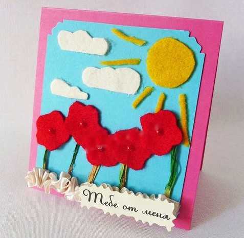 В этом поэтапном мастер-классе подробно рассказано, как сделать своими руками очень необычную, оригинальную и стильную открытку маме на День матери. Малыши в детском саду вряд ли справятся с такой работой, да и ребятам 1-3 классов она покажется немного сложной. А вот школьники постарше осилят это задание без особого напряжения и порадуют своих родительниц броским и эффектным праздничным изделием. Главная «фишка» урока заключается в том, что вместо традиционной цветной бумаги, использующейся обычно для аппликаций, применяется фетр ярких оттенков. Из него вырезают бутоны цветков и крепят на картон. Благодаря тому, что материал имеет мягкую структуру и некоторую ворсистость, открытка получается особенно нежной, уютной и очень приятной на ощупь.