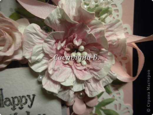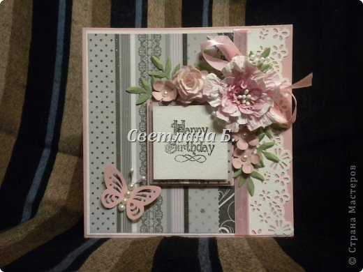 Приветик, мои хорошие, соскучилась по вам. Я недавно вернулась из отпуска, ездила в Севастополь, отдохнула, набралась сил и новых впечатлений. По возвращении домой, сразу сделала открыточку на заказ для учительницы английского языка, с поздравлением на английском языке. Я очень люблю всё розовое, особенно в сочетании с серым и светло зелёным, надеюсь заказчице понравится такое сочетание.
