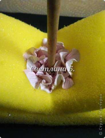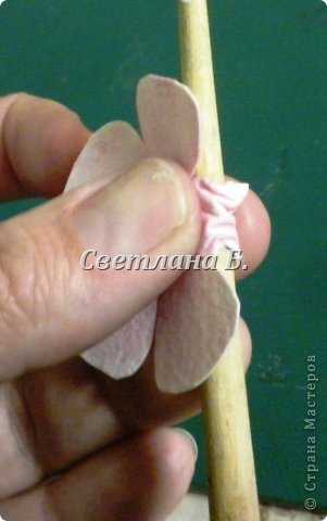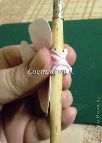 Крупные лепесточки сжимаем на толстой части ручки кисточки. Лепесток обернуть вокруг кисточки, держать двумя пальчиками левой руки, а пальчиками правой сжимаем краешки лепестка сверху и снизу к центру.