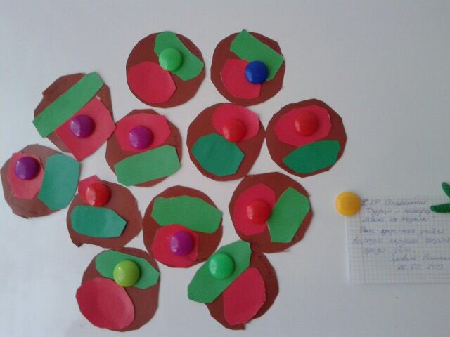 Таким же образом вырезаем и остальные, но берем розовую и желтую бумагу для яблока и вырезаем по 2 яблока каждого цвета.
