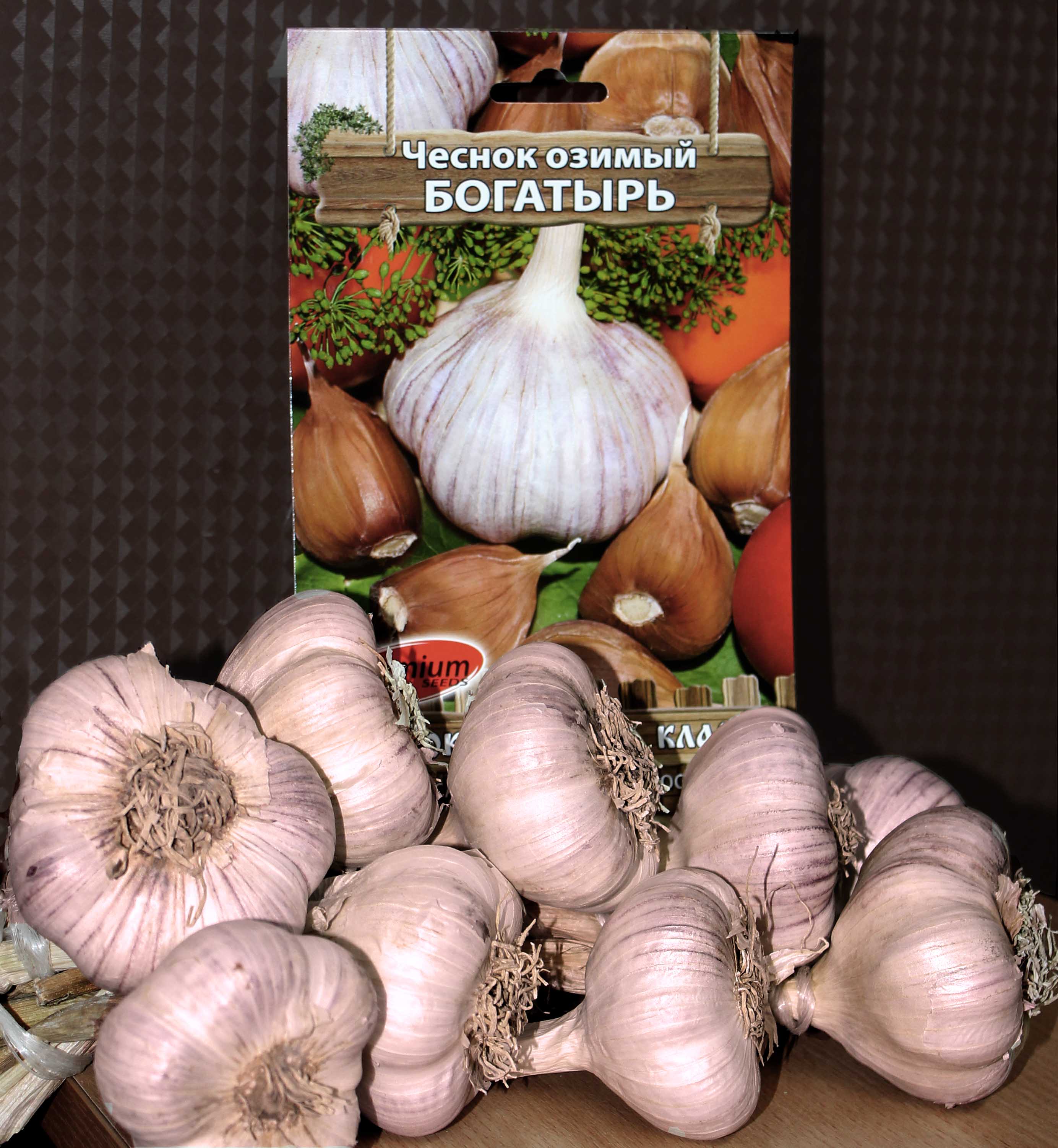 – Богатырь. Обладает крупной луковицей (вес до 85 г) с 5-7 зубками. Форма округло-плоская.