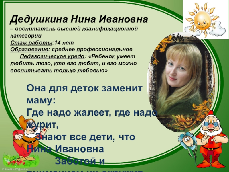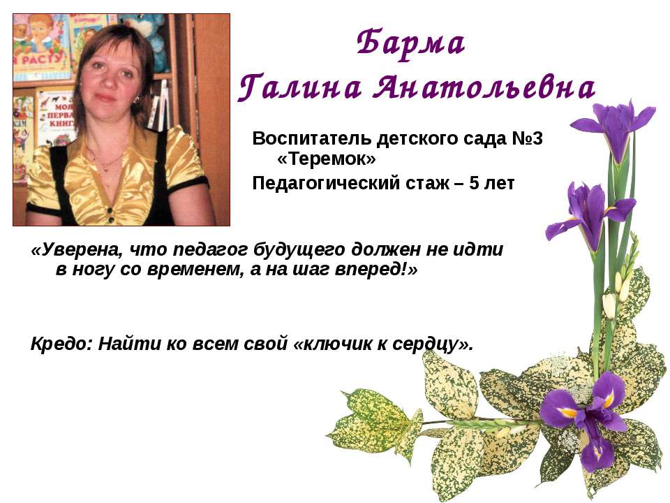 Я бы сказала так: «Воспитатель должен идти не в ногу со временем, а на шаг вперед!» Я выбрала интересную профессию, которая требует от меня огромных сил. Несмотря ни на что я буду дальше отдавать детям тепло своего сердца, тепло своей души. И пусть мир, который окружает моих ребят, станет интереснее и добрее! Пусть наш мир озаряют их искренние улыбки и пытливые глаза!Должность: воспитатель