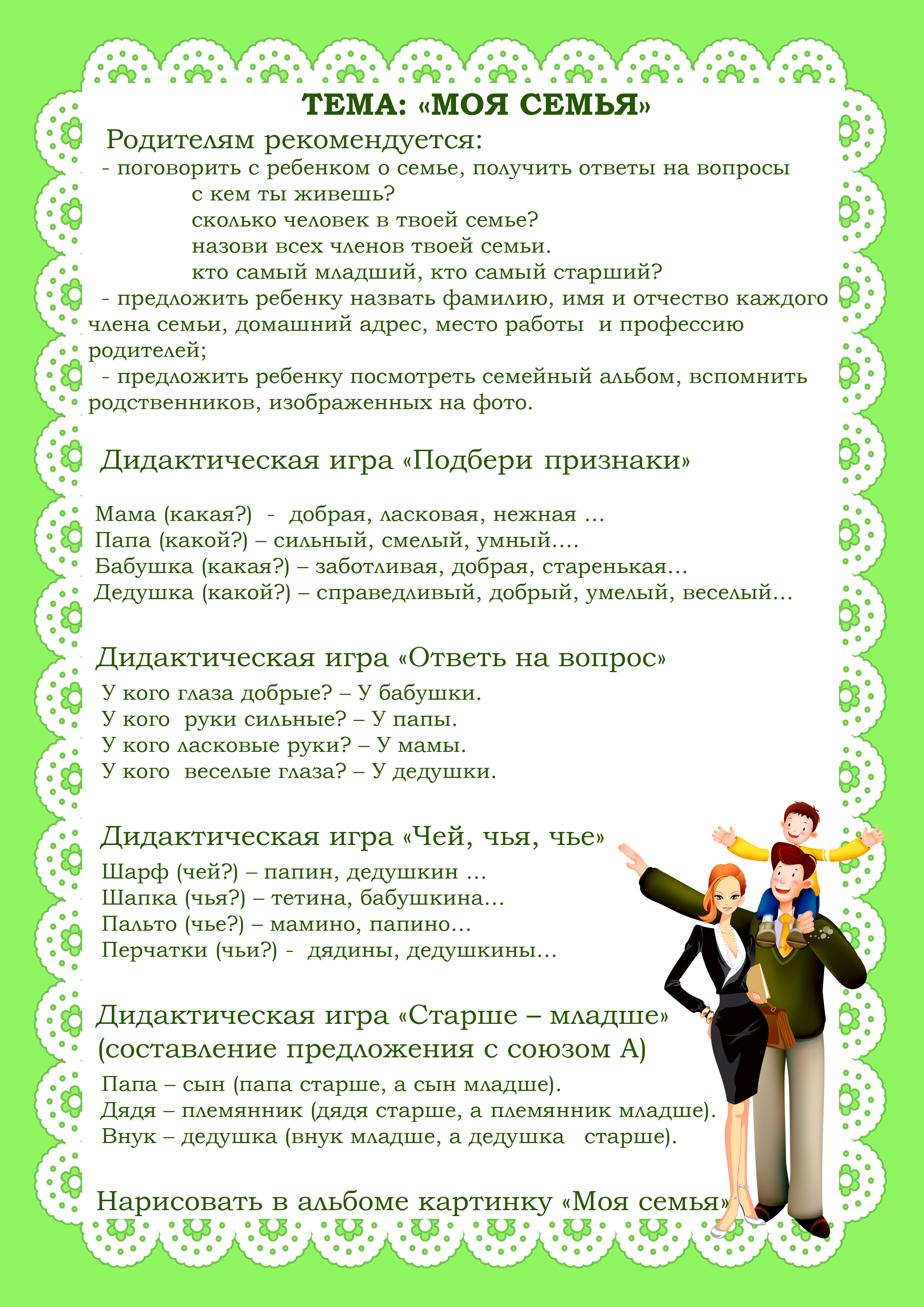 Согласно программе «От рождения до школы» начиная с раннего возраста педагог рассказывает детям о том, что такое семья, беседует о бабушках и дедушках. Расширять знания о семейных взаимоотношениях позволяет рассматривание сюжетных картин, чтение художественной литературы и специально организованные игровые упражнения, отражающие жизнь и поведение взрослых в семье. Подбор игровых упражнений с куклами, беседа о семье и пальчиковые игры по теме вы найдёте в приложении к плану «Тематическая неделя «Наша большая семья».