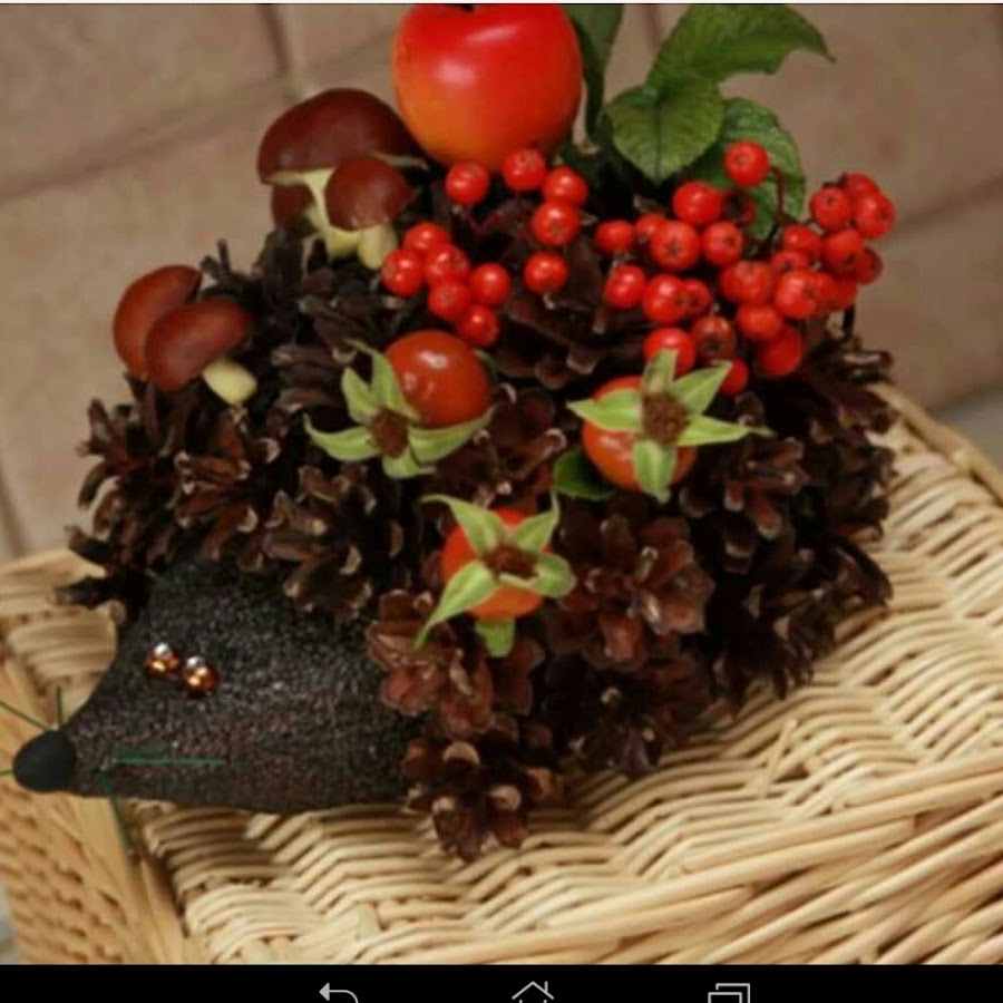 Самый простой материал – сосновые шишки превращаются вот в такую интересную картинку. Возьмем несколько маленьких шишек, из пластилина сделаем мордочку и получится ёжик. Ещё несколько пластилиновых листиков или яблочек, а также листья и веточки рябины для создания общего фона и работа готова.