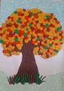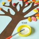 Дерево делается просто – рулончик надрезается треугольником по фасаду. С боков у него щель – в эту прорезь вставляем силуэт кроны дерева из зеленого картона. Все просто. Рулончик красим в коричневую гуашь.
