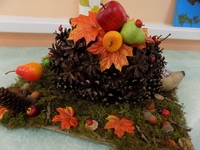 Одна целая – другая с дыркой вместо дна. Склеиваем тарелки вместе донышками вверх. На дно нижней тарелки наносим аппликацию из бумаги и природного материала. По желанию можно сделать проклейку прозрачным целлофаном по второй дырявой тарелке.