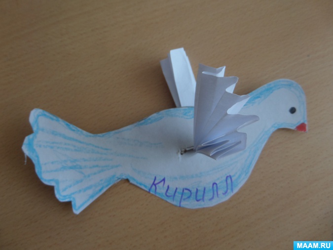 Его также немного согнем (должен выйти мелкий «язычок»), а потом приклеиваем к головке птички. Вот у нас и получился прекрасный голубь. Вы можете подарить его своему ребенку.