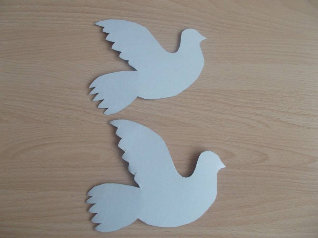 Голубь мира: поделка на 1 мая своими рукамиВсе, что понадобится для ее создания – шаблон, который несложно нарисовать и вырезать на простом бумажном листе. Шаблон представляет собой силуэт двух голубок, спинами сидящих вплотную друг к другу. Чтобы нарисовать таких голубок, сложите лист бумаги пополам, нарисуйте одного голубя, а затем разверните рисунок. Шаблон готов! Следуя такому же принципу, сделайте шаблон крыльев, которые внешне должен напоминать веер. Переведите шаблоны на плотную белую бумагу или картон – и основа поделки готова.